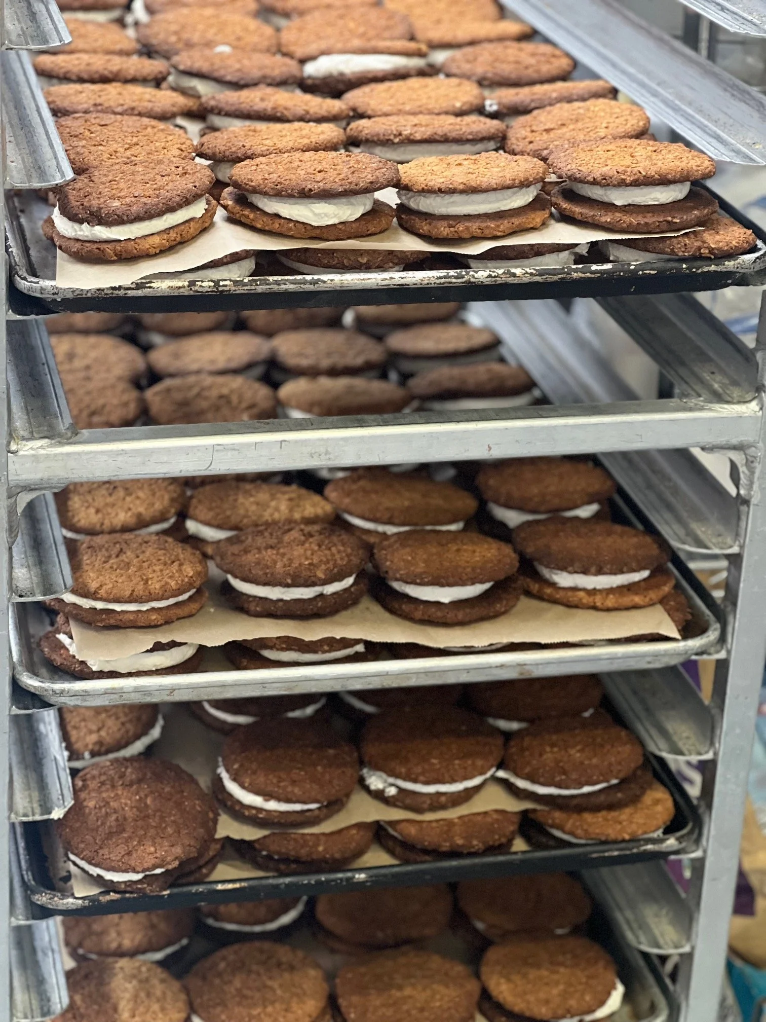 Of all of the treats we produce, one has reached cult-like status- The Oatmeal Cream Pie, or the OCP. A twist on the gas station snack of our youth, but made so much better. Two buttery oatmeal cookies kiss a layer of vanilla oat milk buttercream, making the perfect treat for any occasion.